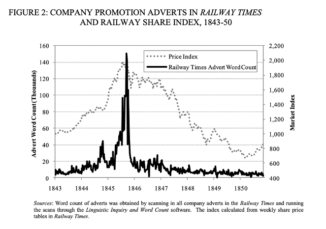 To attract more investors, stocks were allowed to be bought on margin requiring only a 10% deposit of total value. This environment drastically increased the number of investors in the market and the number of railway securities listed on London Stock Exchange, with some stock prices almost tripling. Figure 1 shows the positive correlation between stock prices and promotion adverts during the Railway Mania.